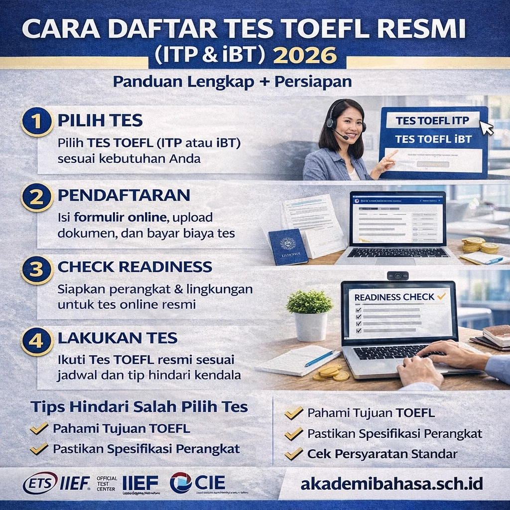 Artikel ini membantu Anda memahami alur pendaftaran TOEFL Resmi secara praktis: (1) jalur TOEFL ITP yang umumnya dipakai untuk kebutuhan administratif/akademik tertentu, dan (2) jalur TOEFL iBT yang sering dipakai untuk kebutuhan internasional. Jika target Anda adalah TOEFL ITP, rujukan pendaftaran utama di Akademi Bahasa Asing ada di halaman TOEFL ITP Resmi.
