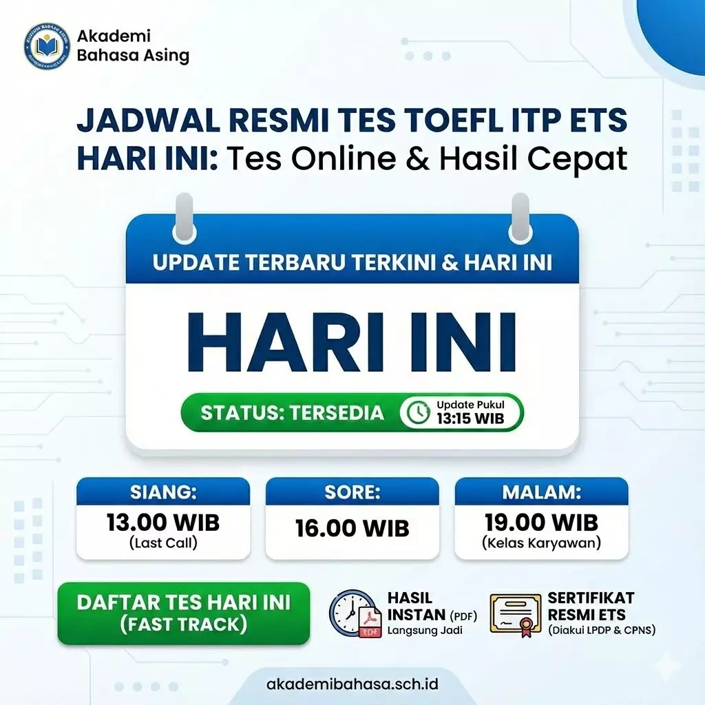 Berdasarkan kalender akademik Akademi Bahasa Asing selaku Test Administration Site (CTAS), layanan Tes TOEFL ITP® Resmi ETS periode Desember 2025 beroperasi secara normal untuk dua moda ujian: