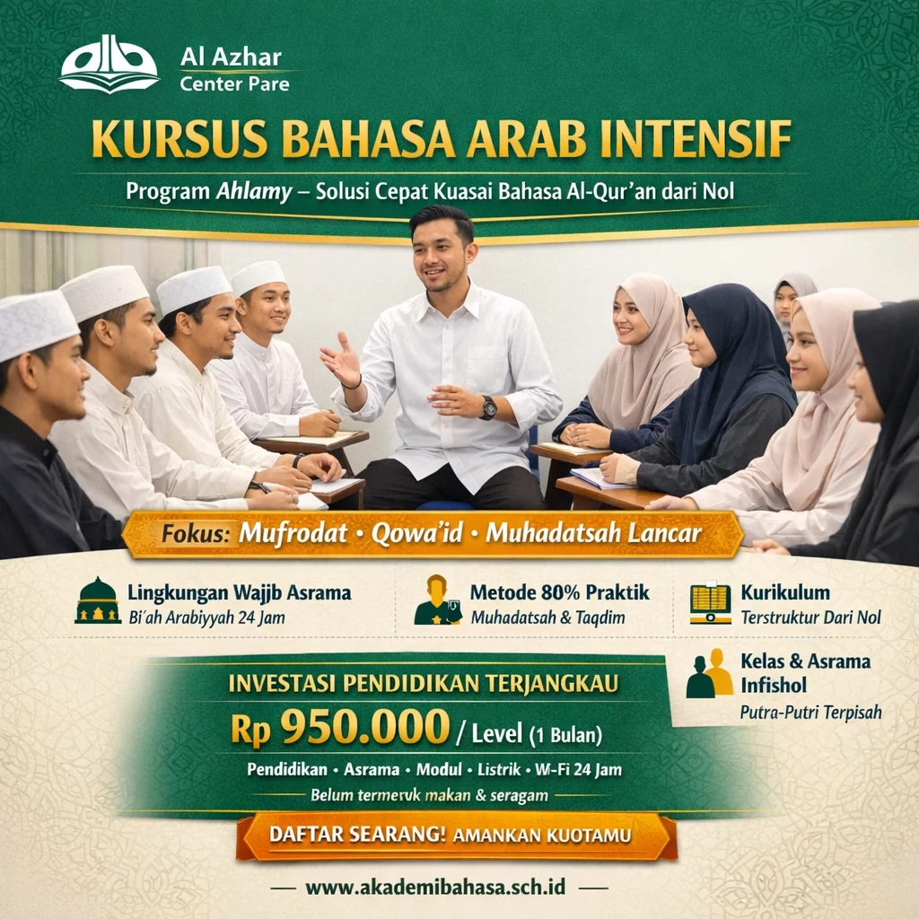 Jangan lewatkan kesempatan untuk bergabung dalam Kursus Bahasa Arab Intensif di Akademi Bahasa Arab – Al Azhar Center Pare. Program Ahlamy dirancang untuk membantu Anda menguasai bahasa Arab dengan cepat, sistematis, dan bermakna. Cocok untuk pemula maupun peserta yang ingin melanjutkan ke studi Timur Tengah.
