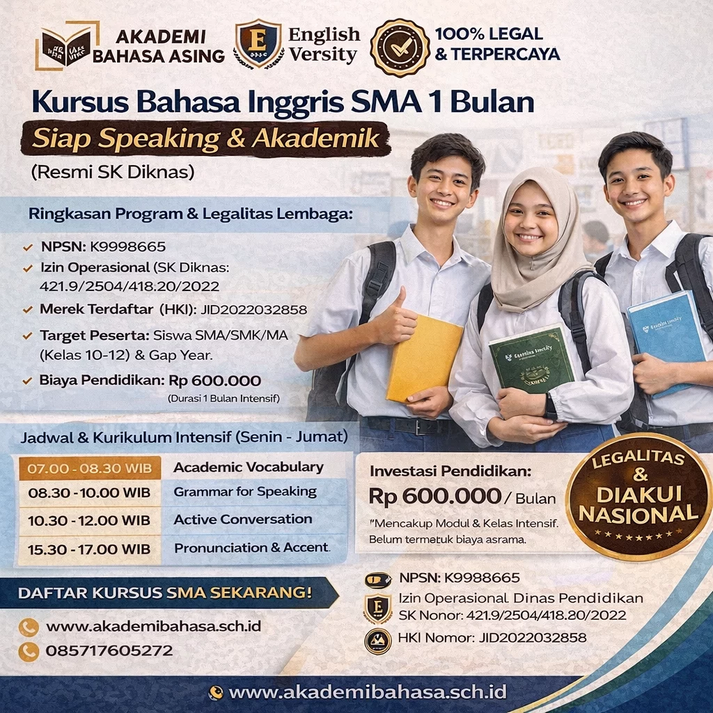 Akademi Bahasa Asing bersama English Versity menghadirkan Program Intensif Bahasa Inggris SMA. Kurikulum dirancang untuk mengubah pengetahuan pasif (Grammar teori) menjadi kemampuan aktif (Komunikasi lancar) dalam waktu 1 bulan.