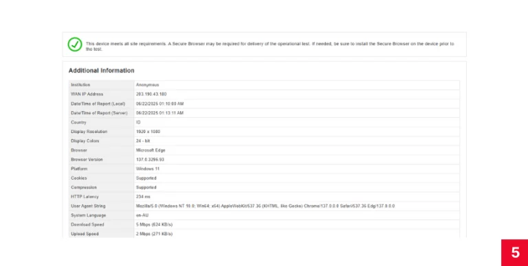 Tahap pertama adalah memvalidasi fungsi kamera, mikrofon, dan resolusi layar. Pastikan Anda menggunakan browser Microsoft Edge (Windows) atau Safari (macOS) untuk menghindari pemblokiran skrip oleh sistem keamanan browser pihak ketiga.