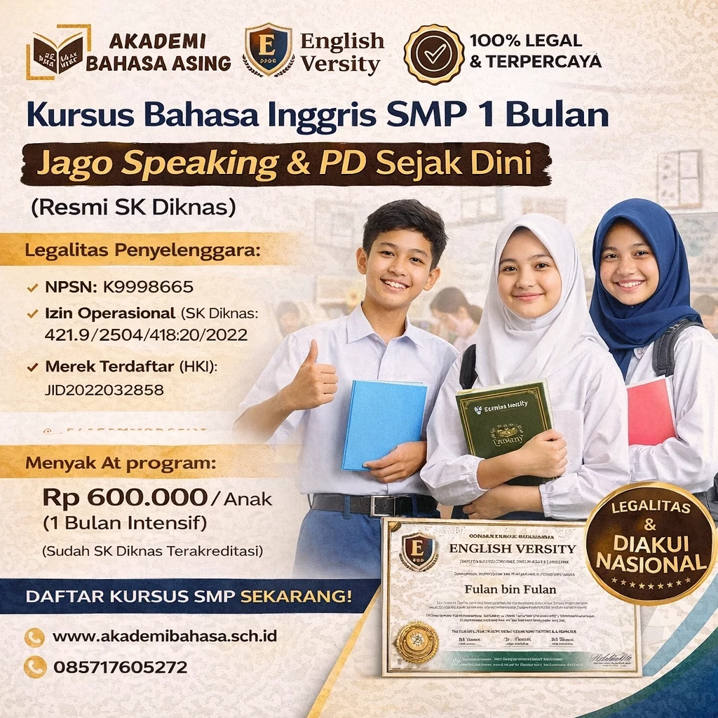 A: Sangat resmi. Program bahasa Inggris diselenggarakan oleh English Versity dengan NPSN K9998665 dan SK Diknas 421.9/2504/418.20/2022. - Q: Apakah program ini aman untuk anak SMP yang baru pertama kali merantau?