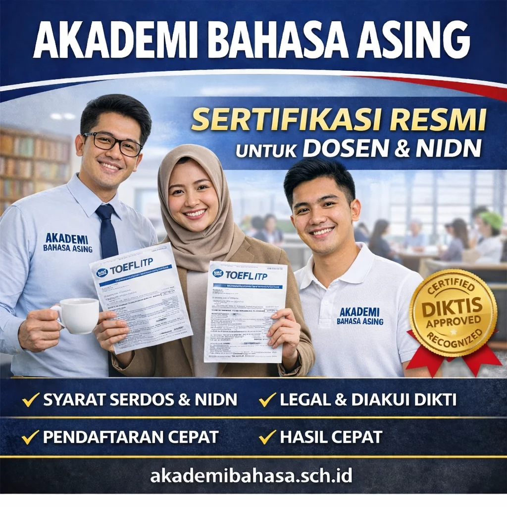 Ringkasan untuk Akademisi: Dalam Pendidikan Tinggi (Dikti), sertifikat kompetensi bahasa Inggris adalah syarat mutlak untuk penerbitan NIDN, Sertifikasi Dosen (Serdos), hingga kenaikan Jabatan Fungsional. Akademi Bahasa Asing memfasilitasi Tes TOEFL ITP Official (Resmi ETS) yang diakui penuh oleh Kemendikbudristek sebagai instrumen valid TKBI (Tes Kemampuan Bahasa Inggris). Hindari sertifikat Prediction yang tidak diakui sistem SISTER.