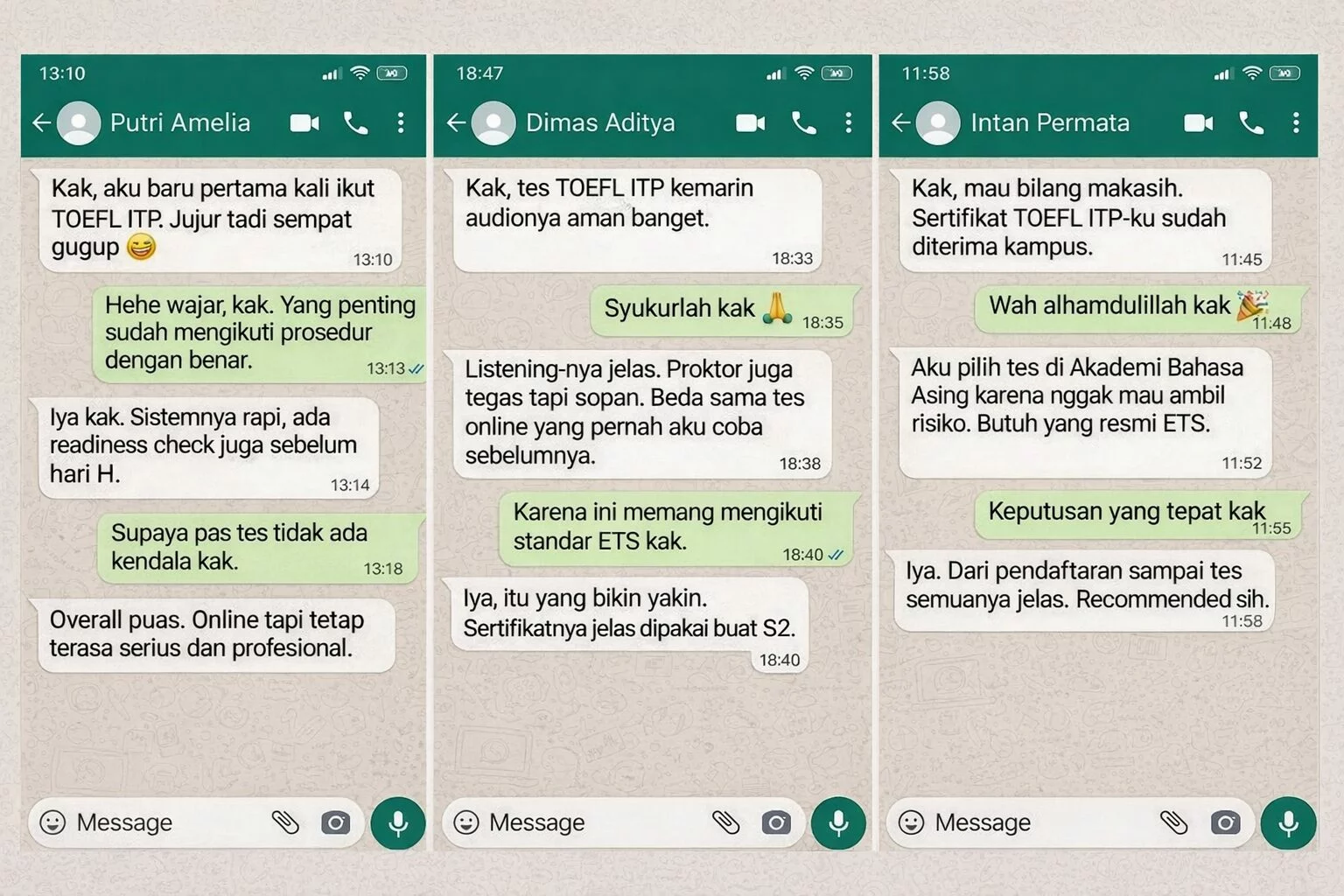 Berikut adalah rangkuman beberapa pengalaman peserta yang telah mengikuti program TOEFL ITP Online Resmi ETS di Akademi Bahasa Asing.